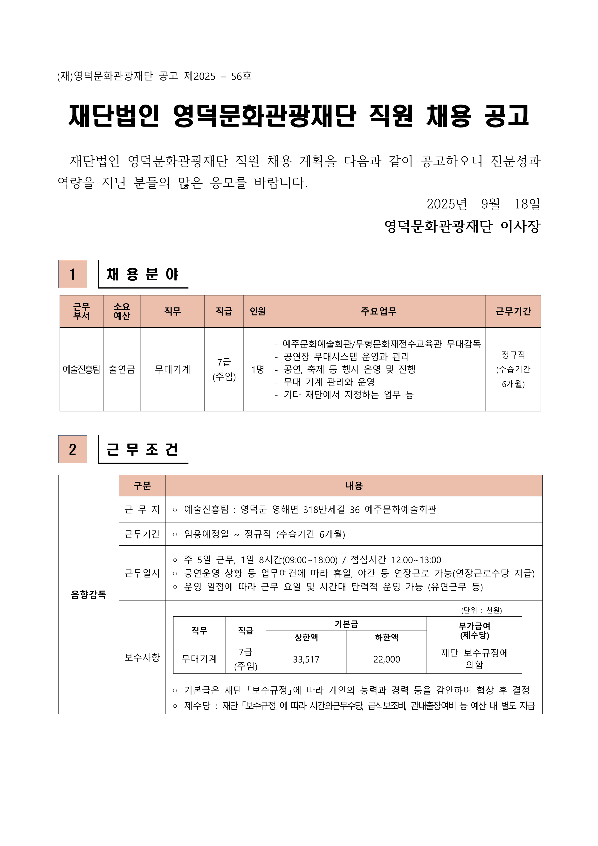 2025년 재단법인 영덕문화관광재단 제7차 직원 채용 공고