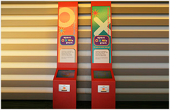 - 연출내용 : 태양열/태양광에너지에 관련된 내용을 학습하는 코너로 미션카드를 넣으면(잎과줄기가 찍힘) PDP화면에 Q&A를 검색하고 그와관련된 OX퀴즈를 풀어볼 수 있도록 연출한다.