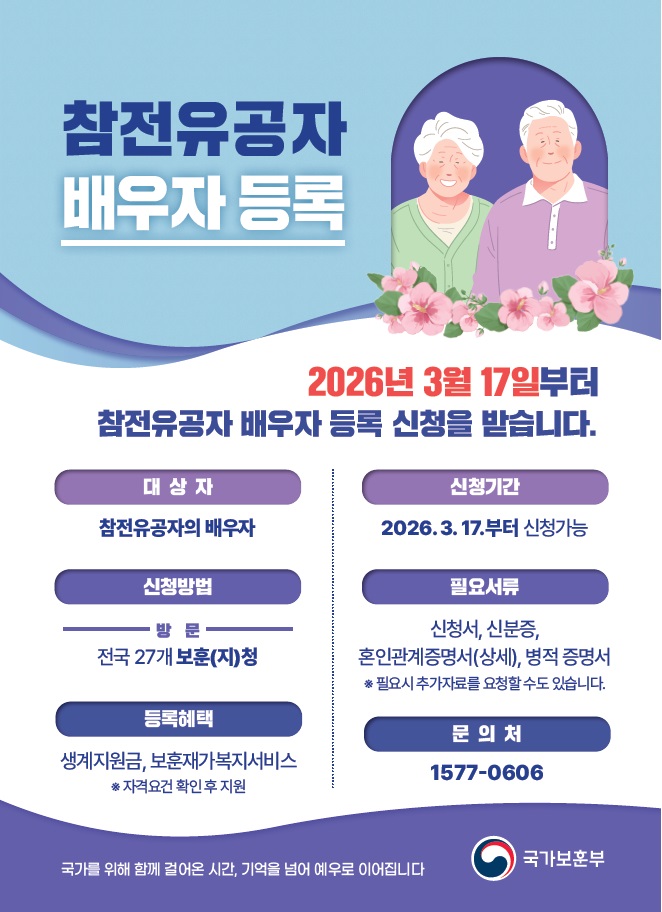 2026.3.17.부터 「참전유공자 예우 및 단체설립에 관한 법률」개정법 시행으로 참전유공자 배우자 등록이 가능해집니다.