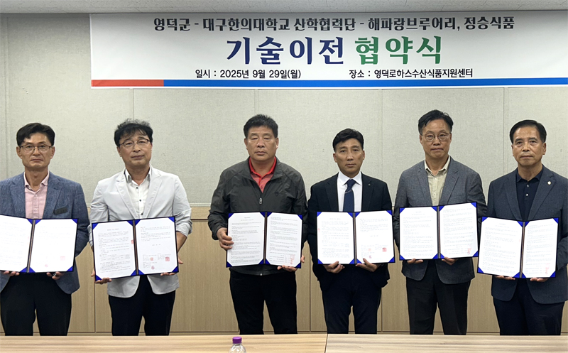 영덕군, 산·학·연·관 참여하는 다자간 기술이전 체결영덕군, 산·학·연·관 참여하는 다자간 기술이전 체결 - 특산물 활용한 특허·제조법 전수로 기업 성장, 경제 활성화 이끌어 - 영덕군과 로하스수산식품지원센터를 위탁 운영하는 대구한의대학교 산학협력단, 그리고 관내 농산물법인 해파랑브루어리와 수산물업체 정승식품이 지난 29일 산·학·연·관 간 기술이전 협약을 체결했다. 이번 기술이전은 영덕군이 ‘영덕로하스 거점 단지 활성화 사업’을 통해 해양자원의 고부가가치를 높이는 기술개발을 진행해 온 결과로, 관내 기업의 경쟁력 강화와 지역 경제 활성화에 이바지할 것으로 기대된다. 이로써 대구한의대학교 산학협력단이 개발하고 영덕군이 소유한 논알코올 맥주맛 음료 제조법과 특허가 해파랑브루어리에, 대게만능스프와 대게어묵탕밀키트 제조법이 정승식품에 이전된다. 논알코올 맥주맛 음료는 영덕의 특산물인 돌미역을 이용한 제품이며, 대게만능스프와 대게어묵탕밀키트는 살균 건조된 영덕대게살이 첨가된 제품이다. 해파랑브루어리는 영덕주조와 협업하여 지역특산물을 이용한 수제맥주 등을 생산하고 있으며, 이번 기술이전을 통해 영덕주조와의 협업으로 논알코올 맥주를 생산하게 돼 미역을 비롯한 지역특산물을 활용한 논알콜 수제맥주 시장을 확장하는데 탄력이 붙을 것으로 기대된다. 이어 정승식품은 홍게어묵 등의 제품을 판매하고 있는 기업으로, 이번 기술이전을 통해 대게 가공 기술을 확보하고, 영덕대게를 비롯해 지역수산물을 활용한 다양한 수산가공 제품을 선보일 계획이다. 영덕군은 이번 기술이전을 시작으로 산·학·연·관 간의 지속적이고 유기적인 협력관계를 구축함으로써 관내 기업들의 효과적인 시장진출과 성장을 돕고 지역경제 활성화의 동력으로 삼겠다는 방침이다. 나아가, 풍부한 지역 수산자원을 활용한 새로운 식품산업의 모델을 구축하고, 해양 바이오 기반 융복합 제품 개발의 가능성 확대해 가면서 지속 가능한 해양·수산 산업을 키워간다는 포부다. 김광열 영덕군수는 “지역의 수산식품 산업은 고부가가치화를 통해 질적 성장을 해 나가야 하는 중요한 시점에 있다”며, “풍부하고 질 높은 지역수산물을 활용한 제품 연구개발을 적극적으로 지원하고 관내 기업과의 협력 체계를 더욱 공고히 해 산업 경쟁력을 확보해 나갈 것”이라고 밝혔다.2025-10-13 -