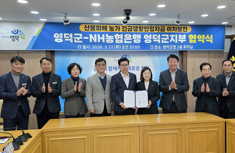 영덕군·NH농협은행, 긴급생활안정자금 이차보전 협약영덕군·NH농협은행, 긴급생활안정자금 이차보전 협약 - 산불 피해 농가 대출 이자 추가 지원 및 상환 기간 연장 - 영덕군은 지난해 3월 말 발생한 경북산불로 어려움을 겪는 농가들의 조속한 영농 재기를 돕기 위해 지난 17일 NH농협은행 영덕군지부와 ‘긴급생활안정자금 이자 지원사업’을 위한 업무 협약을 맺었다. 이번 협약은 산불 피해 농가들의 긴급생활안정자금 대출 상환일이 다가옴에 따른 조치로, 기간 연장과 이자 인하 등의 내용을 담고 있다. 이에 지난해 산불 피해를 본 농가 중 농·축협에서 대출을 받은 758건에 대해선 △대출 이자 1년간 추가 지원 △내년 6월까지 지원 기간 연장 등을 시행해 산불 피해 농가들이 겪는 금융 부담을 낮추고 영농 재기를 돕게 된다. 이와 함께 영덕군은 대상 농가에 신청 방법을 안내하고, 이자 지원금이 신속하게 지급될 수 있도록 복잡한 서류 절차를 대폭 줄이기로 했다. 김광열 영덕군수는 “산불로 검게 탄 농경지를 보며 가슴 졸였을 농민들께 대출 이자 고지서가 또 다른 짐이 되어서는 안 된다”며, “이자 부담을 조금이라도 더는 배려가 농민들이 다시 흙을 일굴 힘을 얻고 평범한 일상으로 돌아가는 데 실질적인 응원이 되길 바란다”라고 전했다.2026-03-20 -