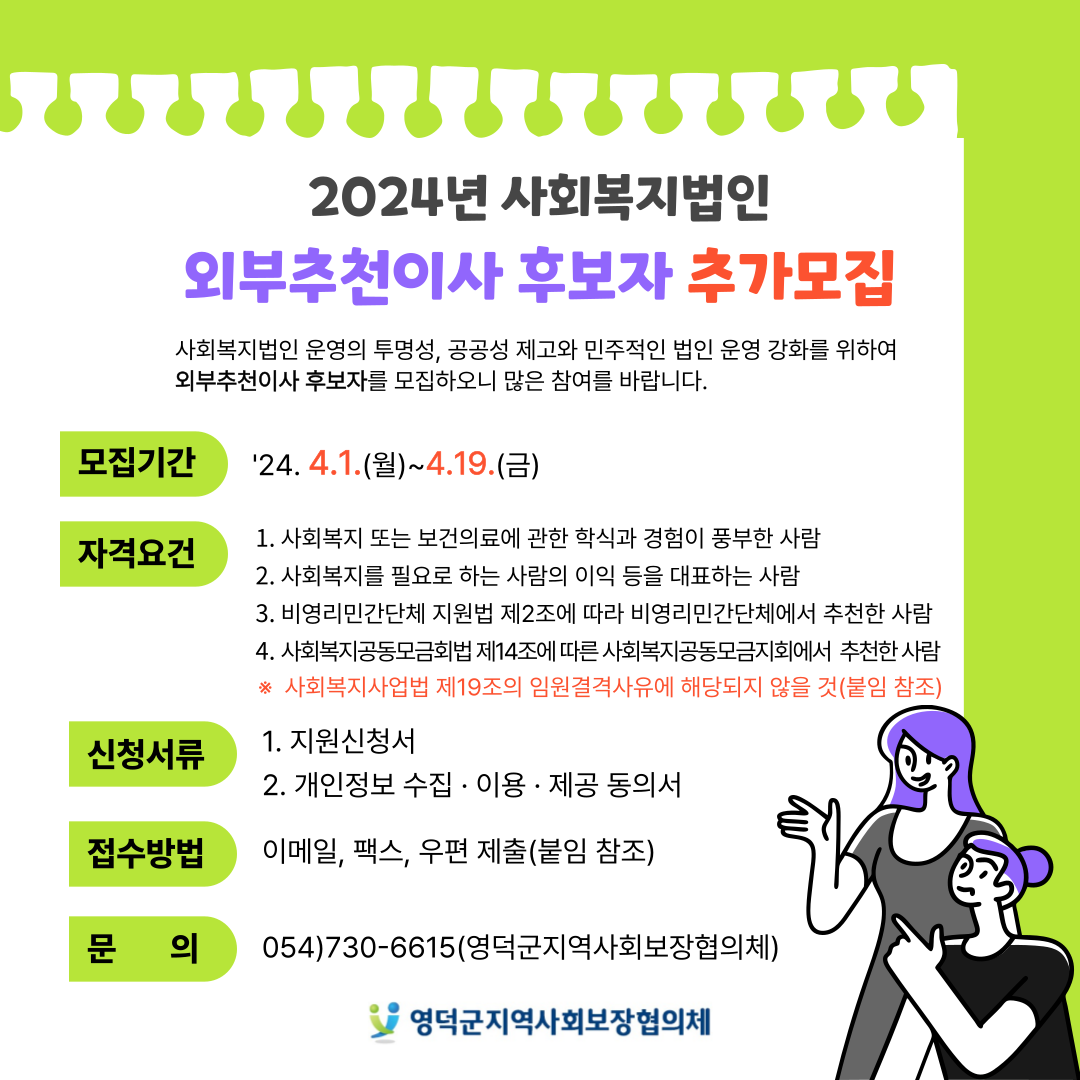 영덕군지역사회보장협의체는 사회복지사업법 제18조에 따라 사회복지법인 운영의 투명성, 공공성 제고와 민주적인 법인 운영 강화를 위하여 외부추천이사 후보자를 추가모집하오니 역량 있는 분들의 많은 참여를 바랍니다.