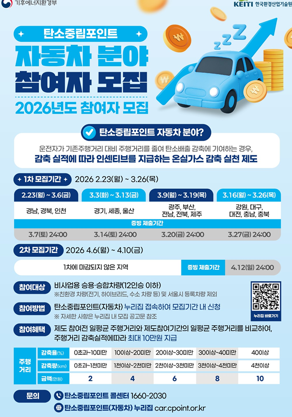 2026년 탄소중립포인트제도 자동차 분야 참여자를 다음과 같이 모집하오니  군민들의 많은 참여 바랍니다.